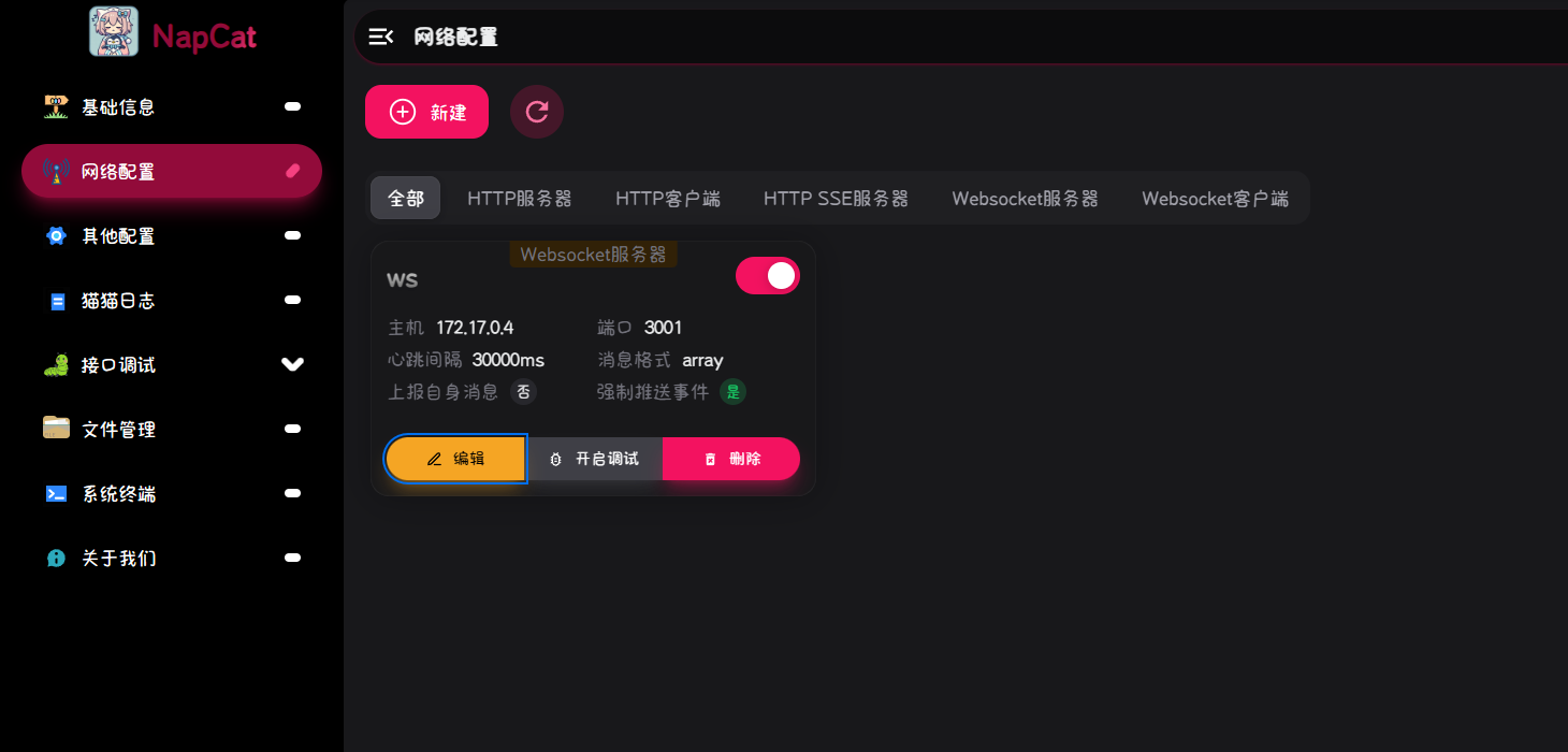 随后进入napcat webui,输入默认token,一般是napcat,后,登录qq,选择网络配置,新建一个websocket服务器