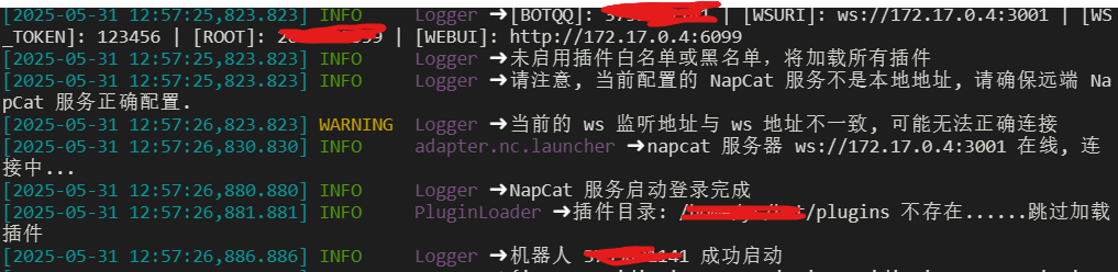 在docker上部署,可以分成两个容器,一个是napcat服务器,一个是ncatbot客户端,当然,你也可以在napcat容器中直接运行bot,你需要下载python和pip3,这个时候就不用配置webui地址和ws地址了(为127.0.0.1)