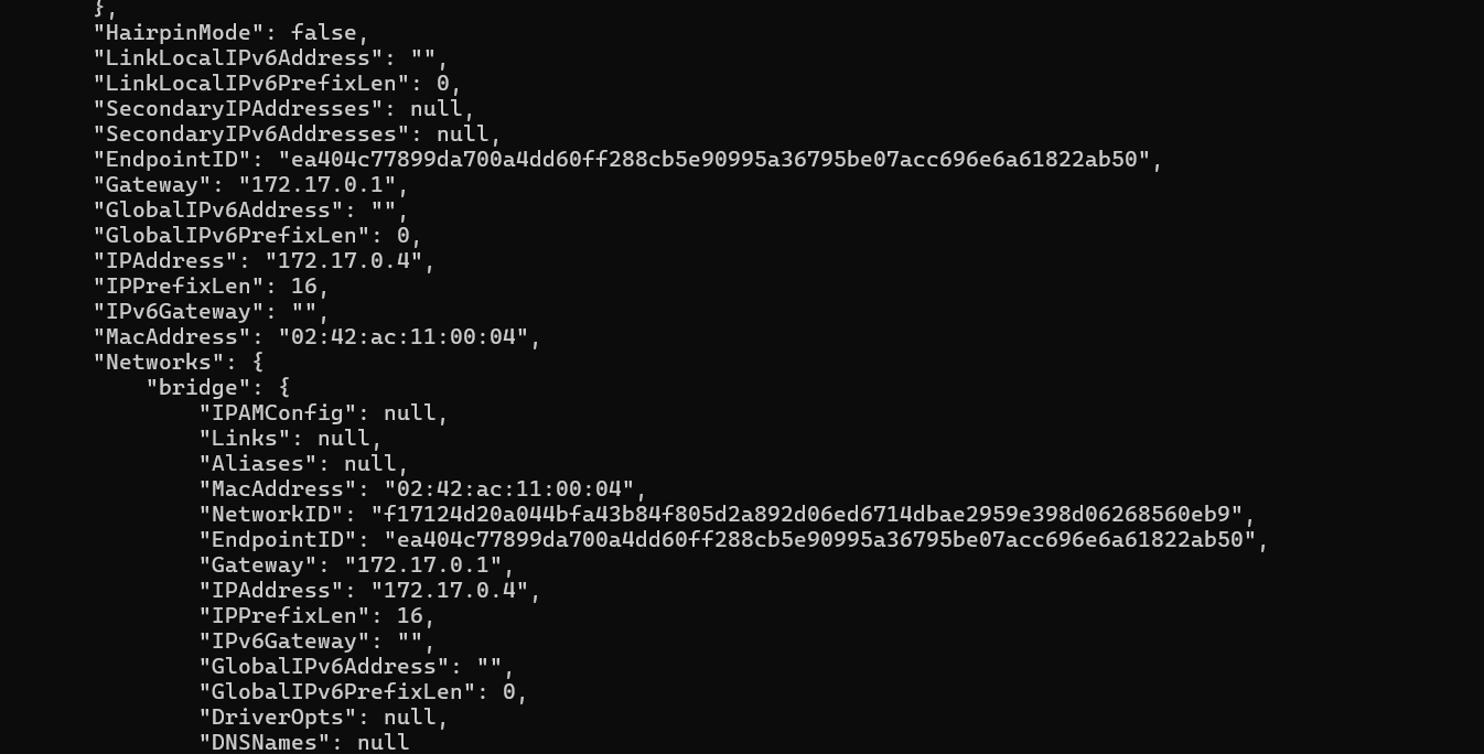在最后出现的IPAddress就是你需要的IP,我的是172.17.0.4